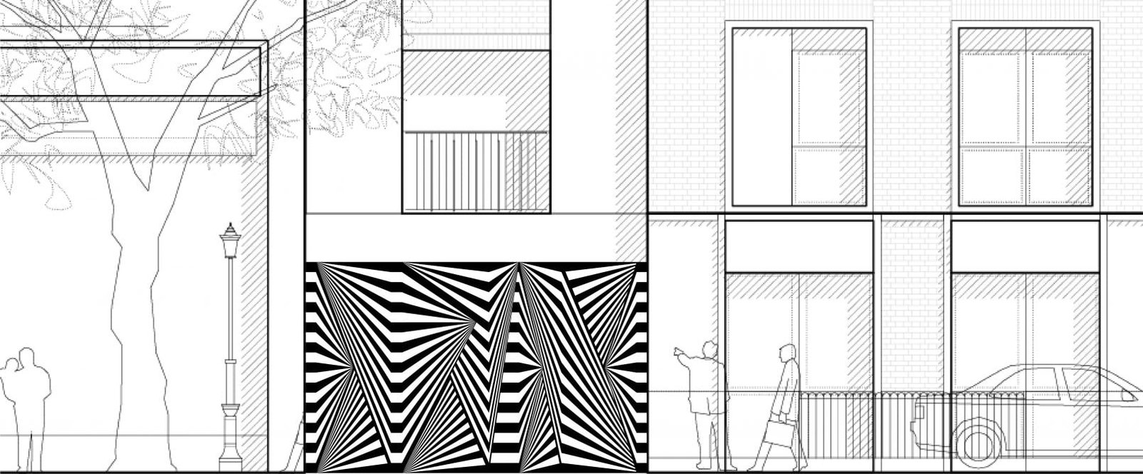 Referencing practice’s association with postmodern thought, I sketched a concept that used as a starting point, basic geometric shapes, that I then overlapped and reduced to the most important architectural element — the line. Resulting lines were then used freely in endless combinations to create a ‘living’ identity unique with every new application.